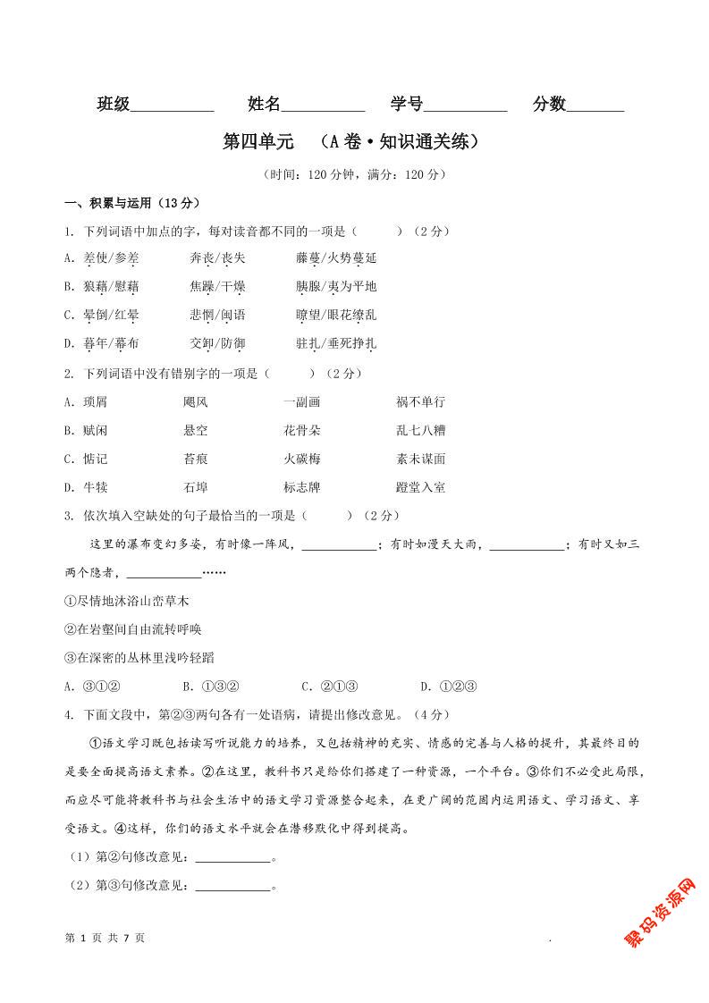 聚码网 八年级 八年级上语文第四单元A卷通关卷 http://www.appstore168.com/95724.html