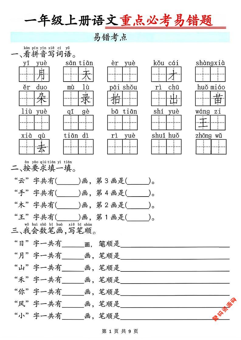 聚码网 一年级 一年级上册语文重点必考易错题9页 http://www.appstore168.com/96483.html