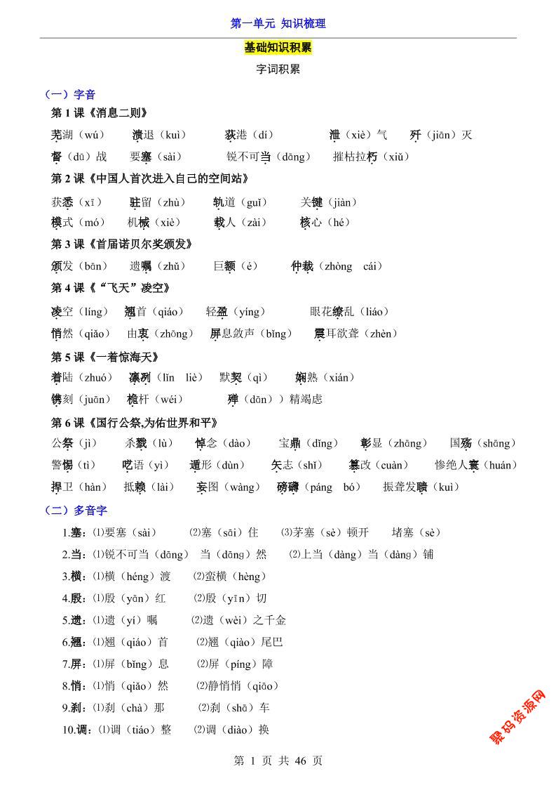 - 八年级上语文第1单元(知识梳理)-知识点 2025-11-29