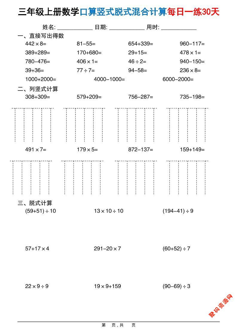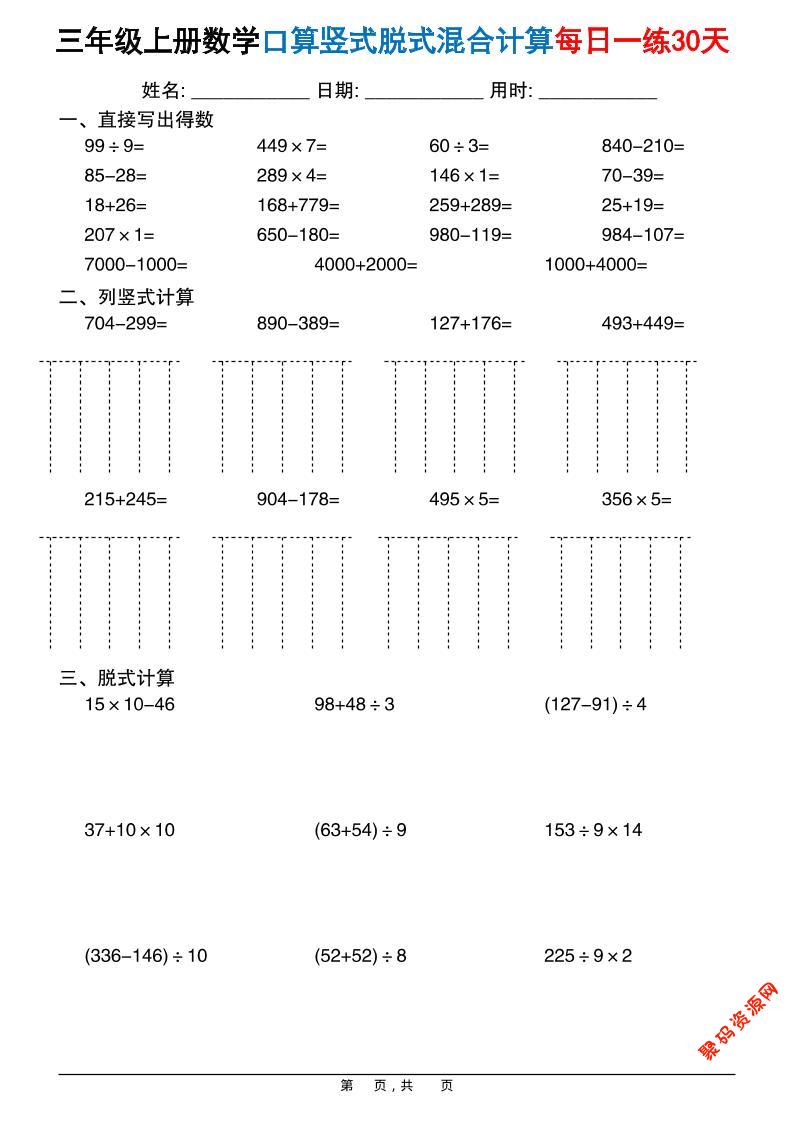 聚码网 三年级 三上数学口算竖式脱式混合计算每日一练30天30页 http://www.appstore168.com/97348.html
