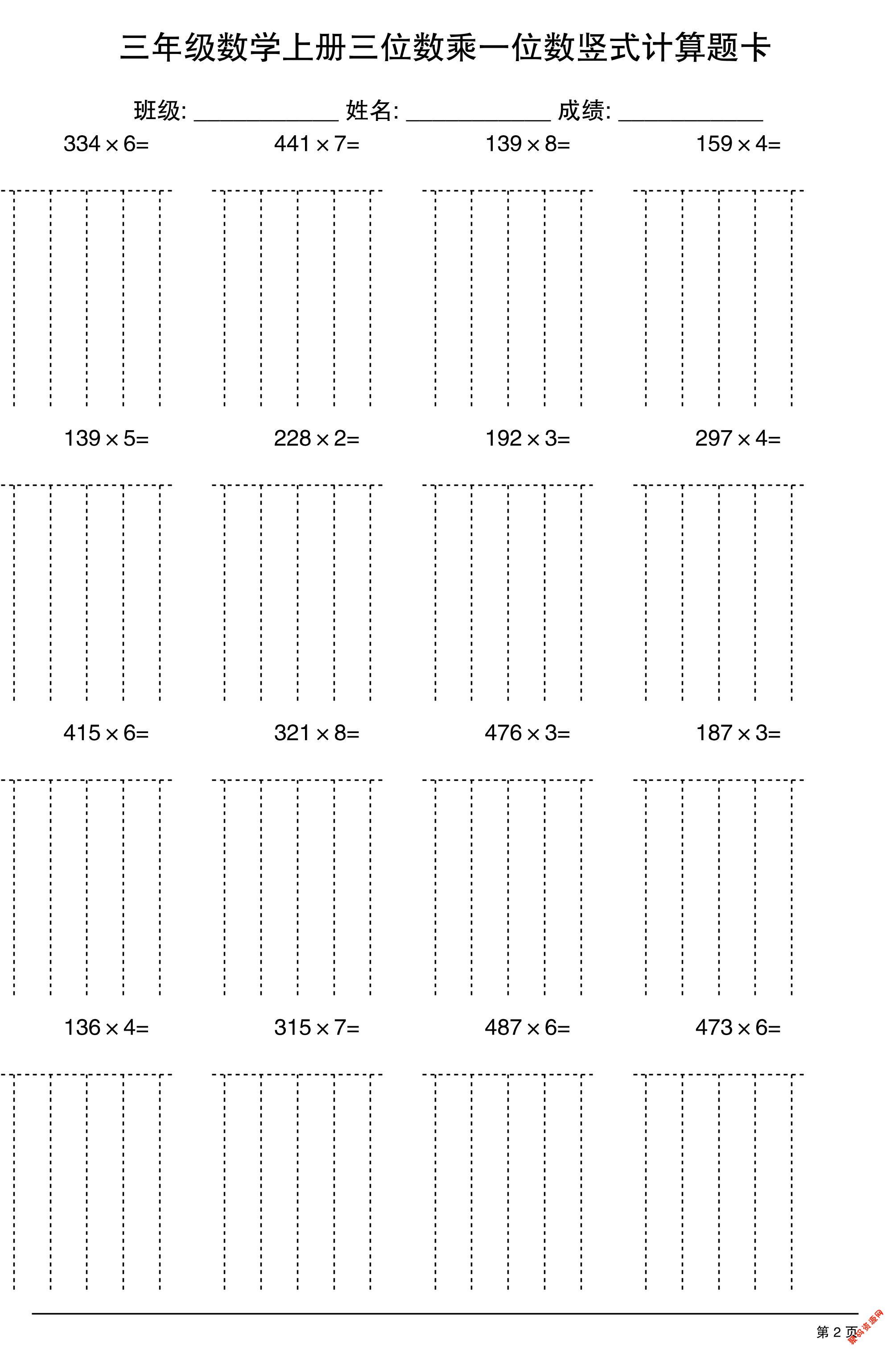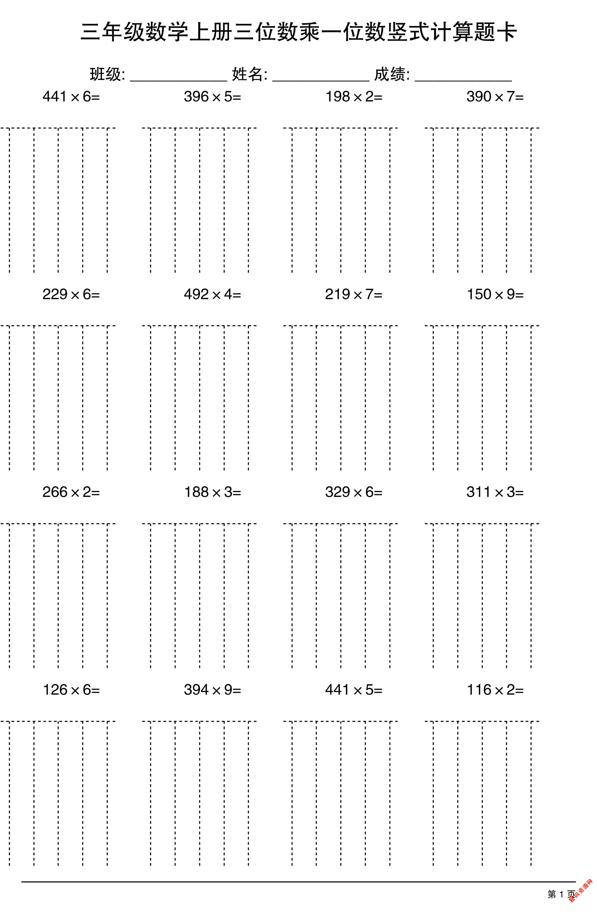 聚码网 三年级 三上数学【三位数乘一位数】竖式计算题卡15页 http://www.appstore168.com/97688.html