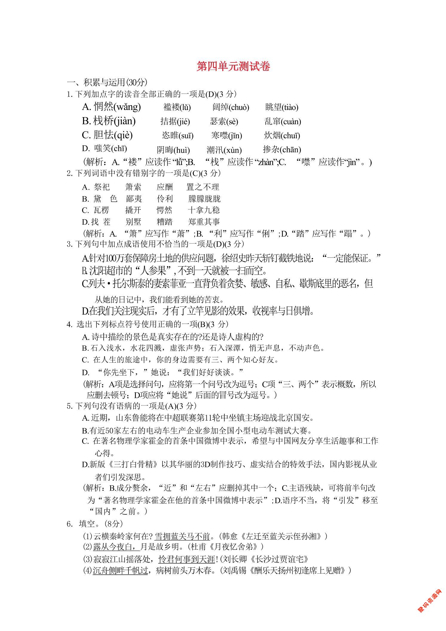 聚码网 九年级 九年级上语文第四单元综合测试卷 http://www.appstore168.com/97796.html