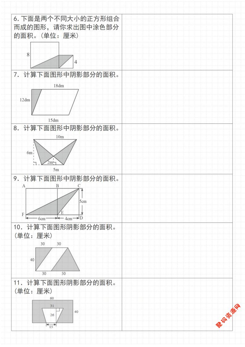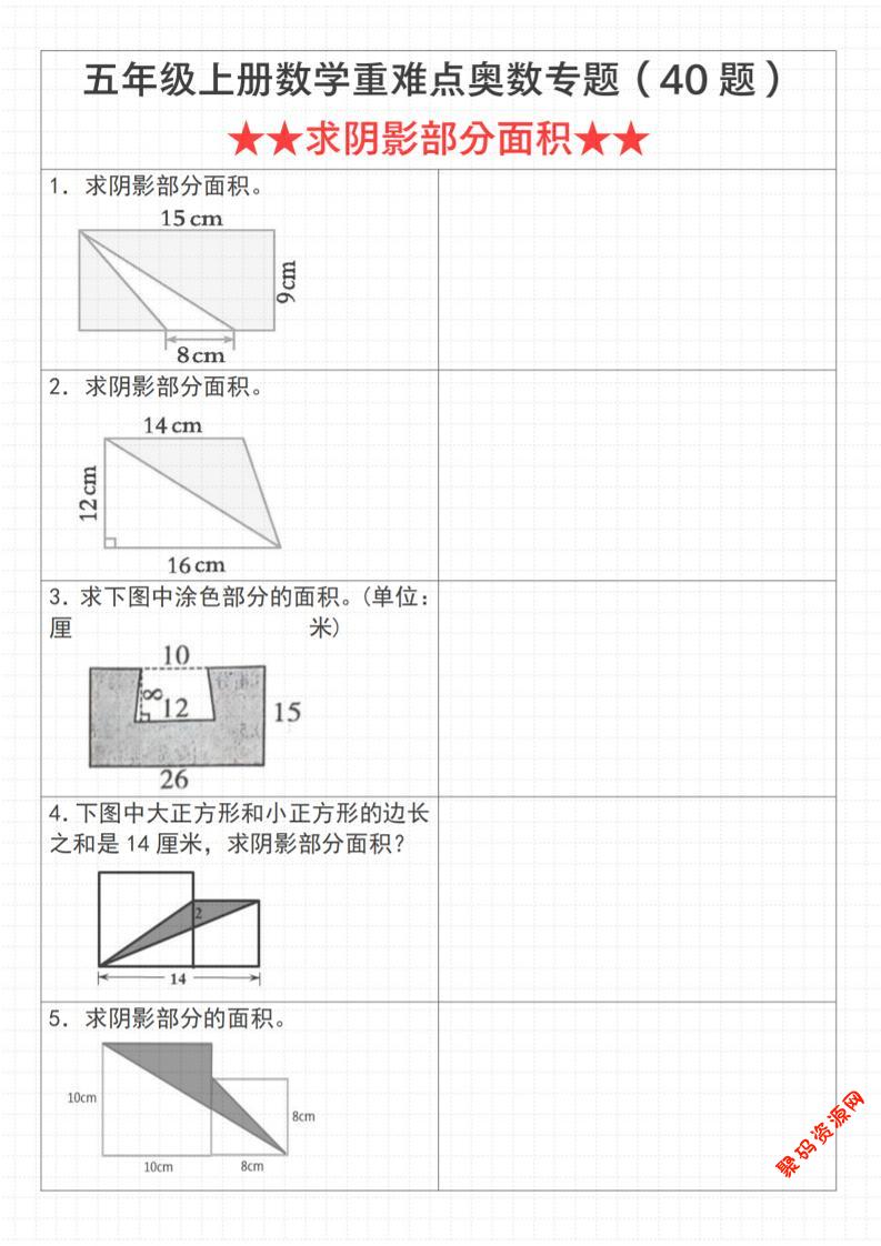 聚码网 五年级 《数学五年级上册数学重难点奥数专题(40题)★★求阴影部分面积★★》通用版_ http://www.appstore168.com/98145.html