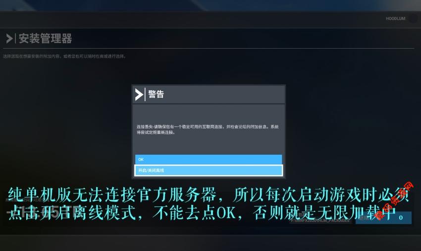 4、进入游戏后,每次都要选择开启离线模式游玩,若选择OK在线模式必定是无限加载中……