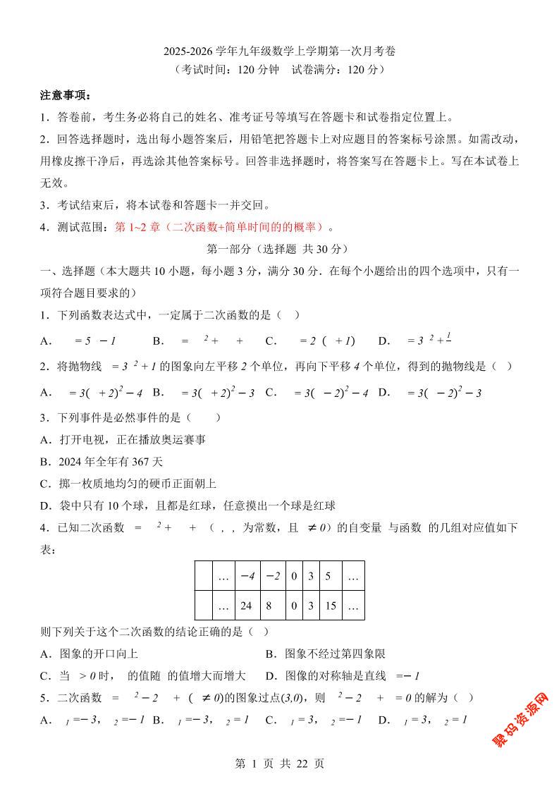 - 新九年级上数学第1次月考01(人教版) 2025-12-09