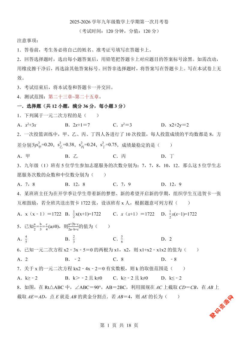 - 新九年级上数学第1次月考01(人教版) 2025-12-09